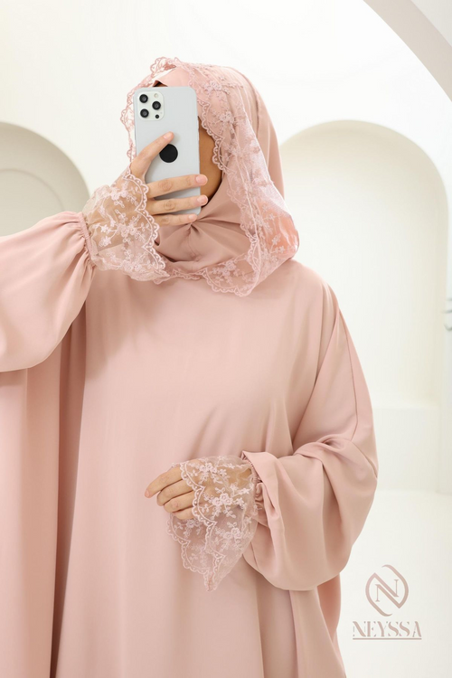 Discover the Abaya Yusr: lightweight, fully opaque crêpe roza for ultimate comfort. Integrated khimar and elegant lace trim ensure coverage with grace.